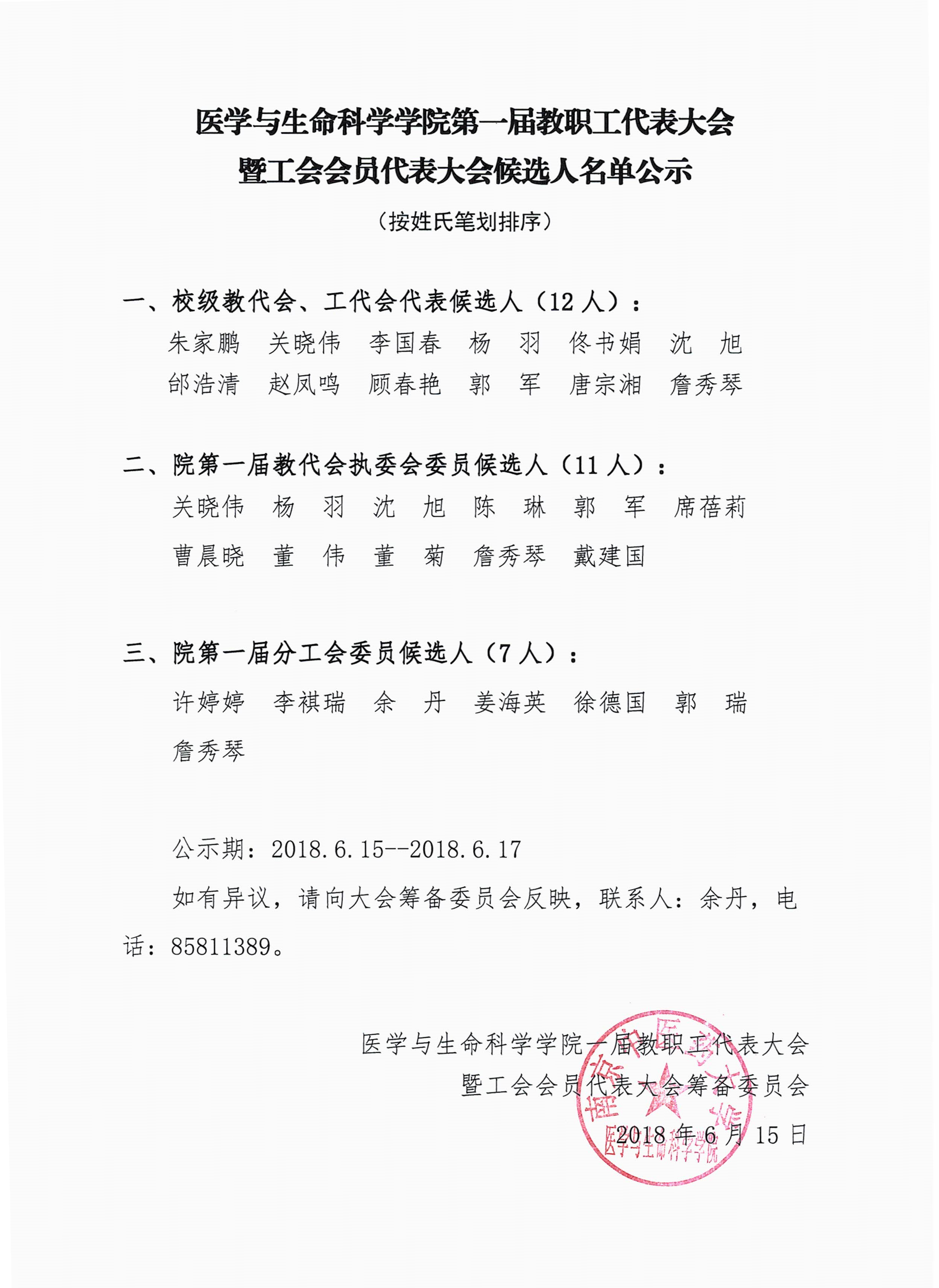医学与生命科学公司第一届教职工代表大会暨工会会员代表大会候选人名单公示