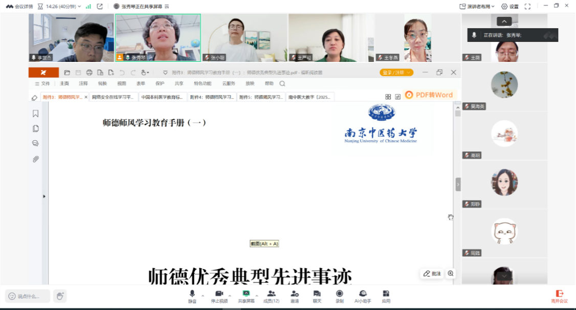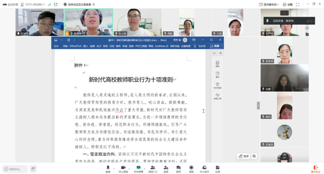 为深入学习贯彻习近平新时代中国特色社会主义思想,贯彻落实习近平总书记关于教育的重要论述和指示批示精神,坚决落实新时代教师职业行为十项准则和研究生导师指导行为准则,加强新形势下师德师风建设,筑牢广大教师为党育人、为国育才初心使命,根据公司和公司关于开展师德师风集中学习教育有关事宜的通知,心理学教研室在9月17日,利用腾讯会议在线召开了全院师德师风专题学习会,会议由学系主任张秀琴主持,全体教师参加。
