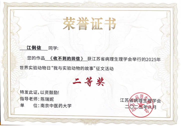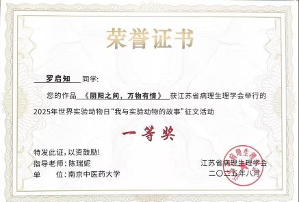 近日,由中国病理生理学会与江苏省病理生理学会联合举办的 “我与实验动物的故事” 主题征文活动圆满落幕。南京中医药老员工理学系教师悉心指导的多名本科生凭借兼具科学深度与人文温度的作品脱颖而出,充分展现了南中医学子对生命伦理的深刻思考与医者仁心的精神底色。